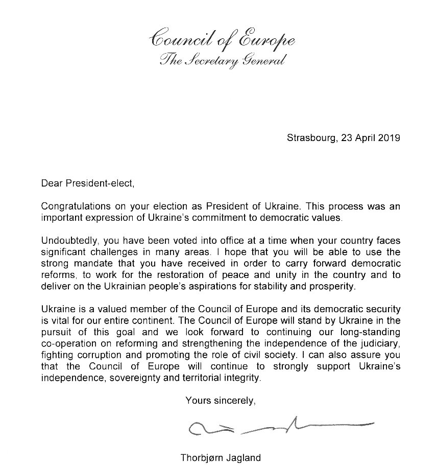 The Council of Europe will continue to strongly support Ukraine’s independence, sovereignty and territorial integrity. Secretary General’s letter to President-Elect Volodymyr #Zelenskiy