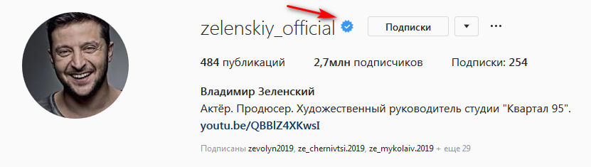Настоящий аккаунт Владимира Зеленского в Instagram имеет знак верификации.