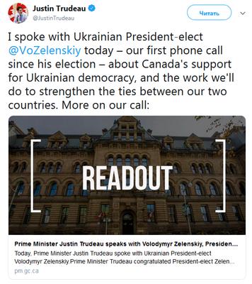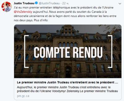 J'ai eu mon premier entretien téléphonique avec le président élu de l’Ukraine @VoZelenskiy aujourd'hui. Nous avons parlé du soutien du Canada à la démocratie ukrainienne et de la façon dont nous allons renforcer les liens entre nos deux pays.